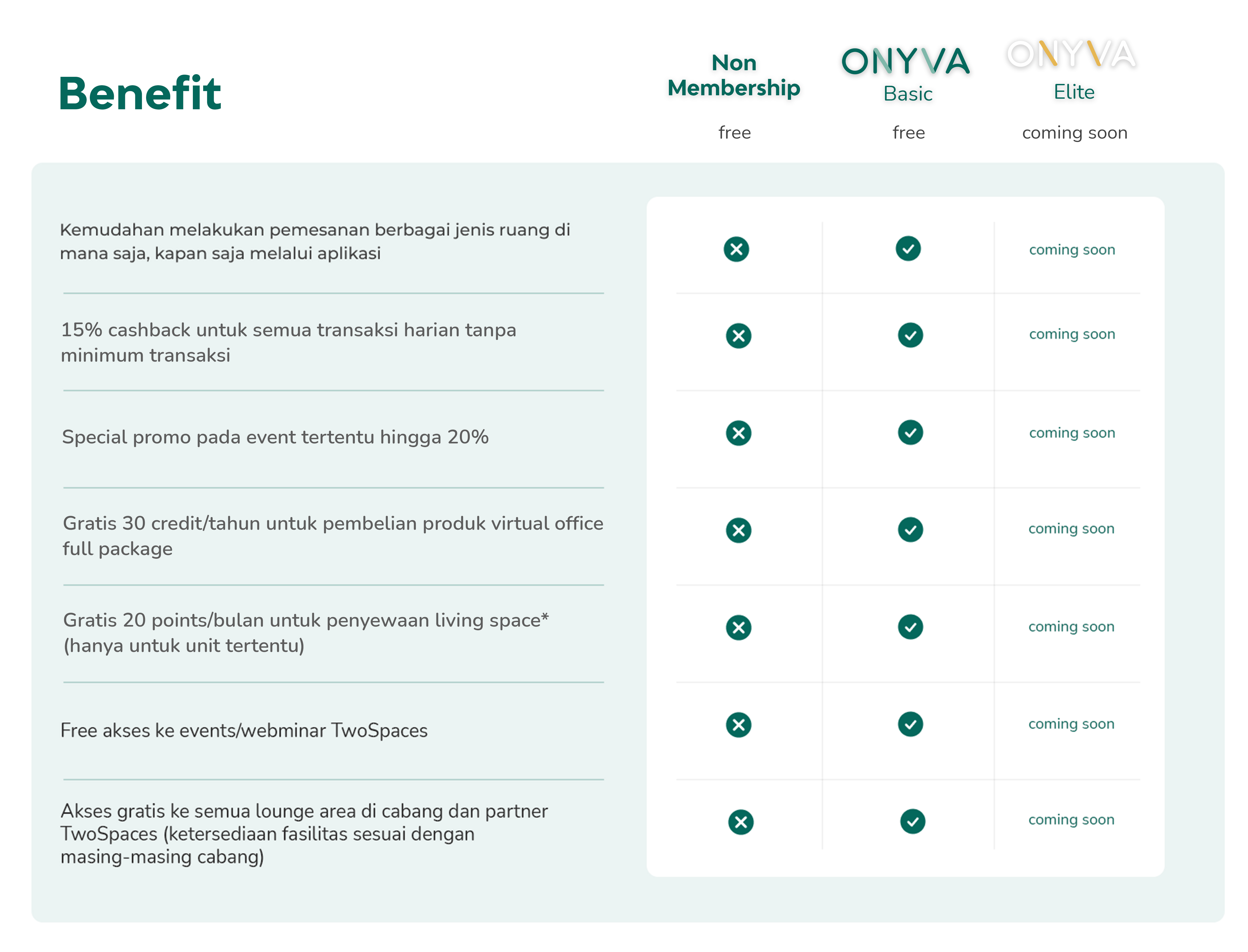 Onyva Membership adalah membership plan dari TwoSpaces dengan skema pay-as-you-go. Ini adalah solusi atas permintaan penggunaan ruang berbasis on-demand.